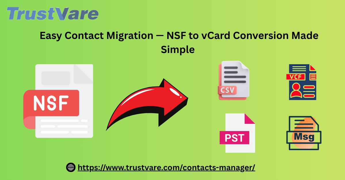 TrustVare NSF Contact Converter makes it simple for usersto migrate Lotus Notes contacts to vCard format. It works as an advanced NSF toVCF converter, ensuring data integrity during conversion. This tool alsofunctions as a powerful NSF to vCard converter, providing flexibility for usersto access contacts anywhere. Convert NSF to VCF is quickly done by userswithout the fear of data loss or errors. All Windows versions and vCardversions, such as 2.0, 3.1, and 4.1, are supported by the tool, with great compatibility.The straightforward interface of the software ensures an easy process forusers. A demo version is free to try so that users can try before they buy. Itis the best choice for anyone needing reliable and fast contact migration.